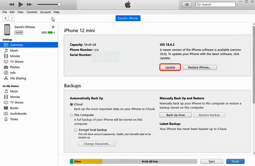 - 3. Cuando el dispositivo sea detectado, haz clic en Actualizar. Tus datos no se perderán.
